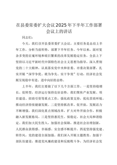 【七哥公文】2025年:在县委常委扩大会议2025年下半年工作部署会议上的讲话+更多免费公文+VX:QiGeGongWen2024
