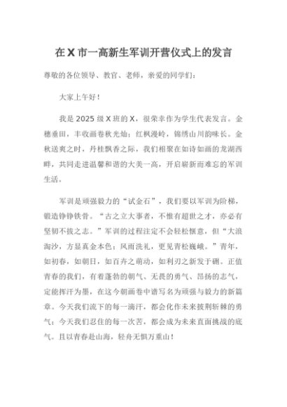 / 【七哥公文】2025年:在X市一高新生军训开营仪式上的发言+更多免费公文+VX:QiGeGongWen2024