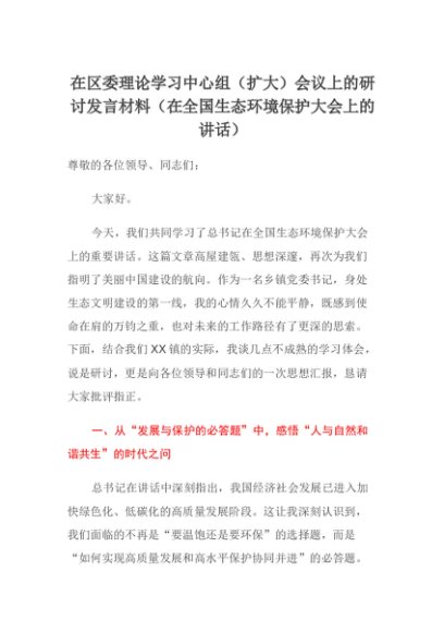 【七哥公文】2025年:在区委理论学习中心组(扩大)会议上的研讨发言材料(在全国生态环境保护大会上的讲话)+更多免费公文+VX:QiGeGongWen2024