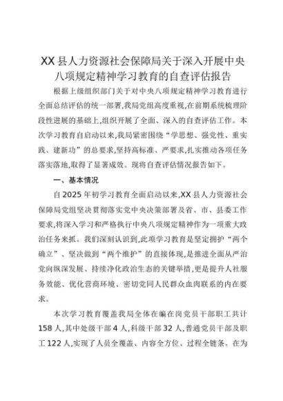 【七哥公文】2025年:XX县人力资源社会保障局关于深入开展中央八项规定精神学习教育的自查评估报告+更多免费公文+VX:QiGeGongWen2024