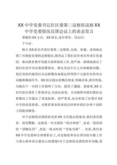【七哥公文】2025年:XX中学党委书记在区委第二巡察组巡察XX中学党委情况反馈会议上的表态发言+更多免费公文+VX:QiGeGongWen2024