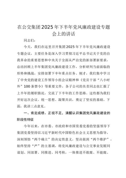 【七哥公文】2025年:在公交集团2025年下半年党风廉政建设专题会上的讲话+更多免费公文+VX:QiGeGongWen2024