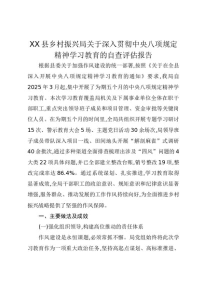 【七哥公文】2025年:XX县乡村振兴局关于深入贯彻中央八项规定精神学习教育的自查评估报告+更多免费公文+VX:QiGeGongWen2024