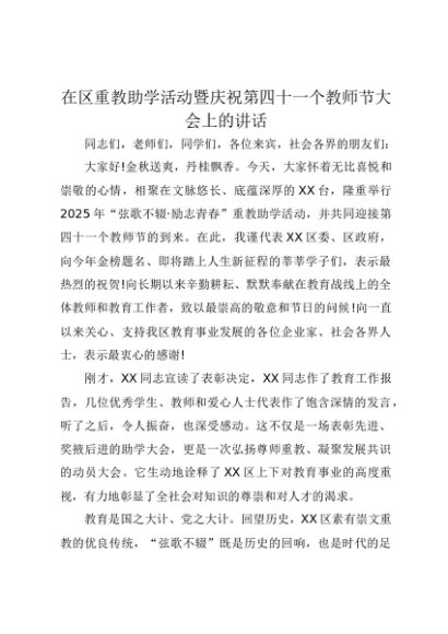 【七哥公文】2025年:在区重教助学活动暨庆祝第四十一个教师节大会上的讲话+更多免费公文+VX:QiGeGongWen2024