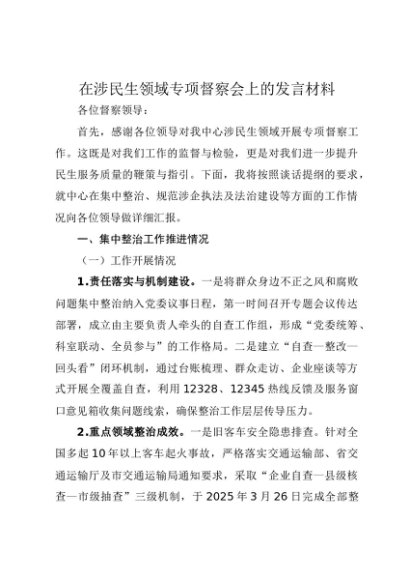 / 【七哥公文】2025年:在涉民生领域专项督察会上的发言材料+更多免费公文+VX:QiGeGongWen2024