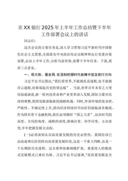 【七哥公文】2025年:在XX银行2025年上半年工作总结暨下半年工作部署会议上的讲话+更多免费公文+VX:QiGeGongWen2024