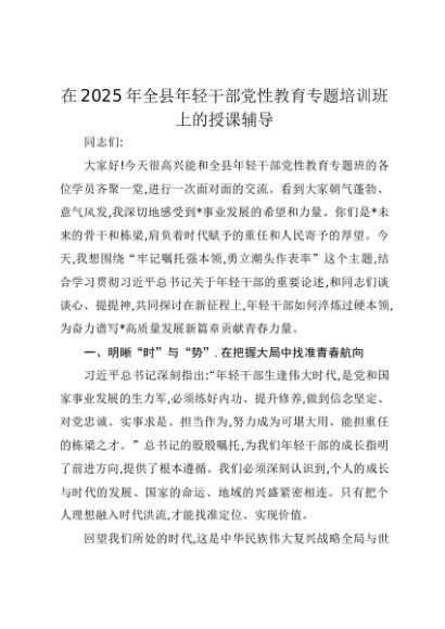 【七哥公文】2025年:在2025年全县年轻干部党性教育专题培训班上的授课辅导+更多免费公文+VX:QiGeGongWen2024