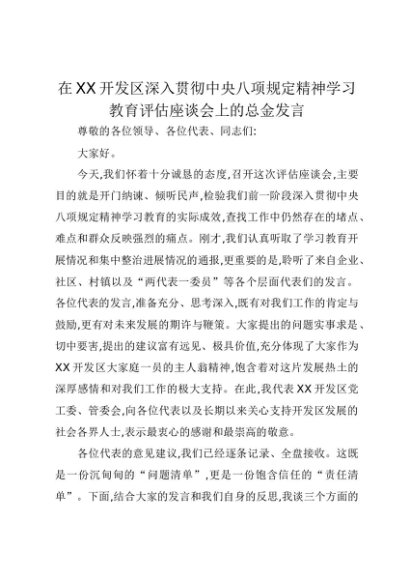 【七哥公文】2025年:在XX开发区深入贯彻中央八项规定精神学习教育评估座谈会上的总金发言+更多免费公文+VX:QiGeGongWen2024