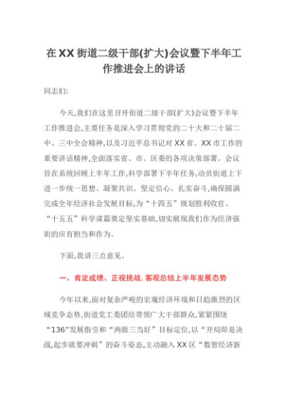 【七哥公文】2025年:在XX街道二级干部(扩大)会议暨下半年工作推进会上的讲话+更多免费公文+VX:QiGeGongWen2024