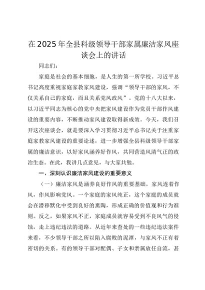 【七哥公文】2025年:在2025年全县科级领导干部家属廉洁家风座谈会上的讲话+更多免费公文+VX:QiGeGongWen2024