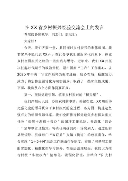 / 【七哥公文】2025年:在XX省乡村振兴经验交流会上的发言+更多免费公文+VX:QiGeGongWen2024