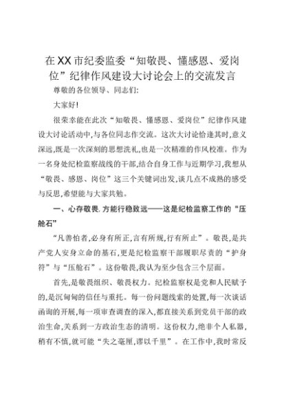 【七哥公文】2025年:在XX市纪委监委“知敬畏、懂感恩、爱岗位”纪律作风建设大讨论会上的交流发言+更多免费公文+VX:QiGeGongWen2024