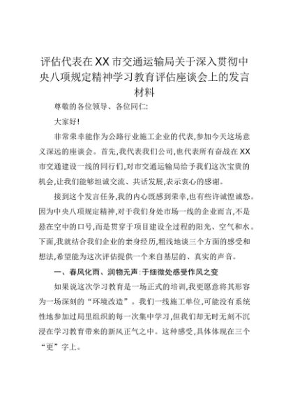 【七哥公文】2025年:评估代表在XX市交通运输局关于深入贯彻中央八项规定精神学习教育评估座谈会上的发言材料+更多免费公文+VX:QiGeGongWen2024