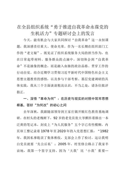 【七哥公文】2025年:在全县组织系统“勇于推进自我革命 永葆党的生机活力”专题研讨会上的发言+更多免费公文+VX:QiGeGongWen2024