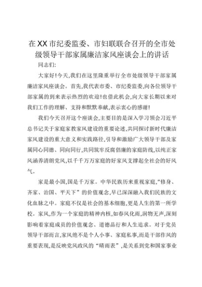 【七哥公文】2025年:在XX市纪委监委、市妇联联合召开的全市处级领导干部家属廉洁家风座谈会上的讲话+更多免费公文+VX:QiGeGongWen2024