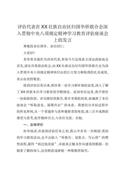 【七哥公文】2025年:评估代表在XX壮族自治区归国华侨联合会深入贯彻中央八项规定精神学习教育评估座谈会上的发言+更多免费公文+VX:QiGeGongWen2024