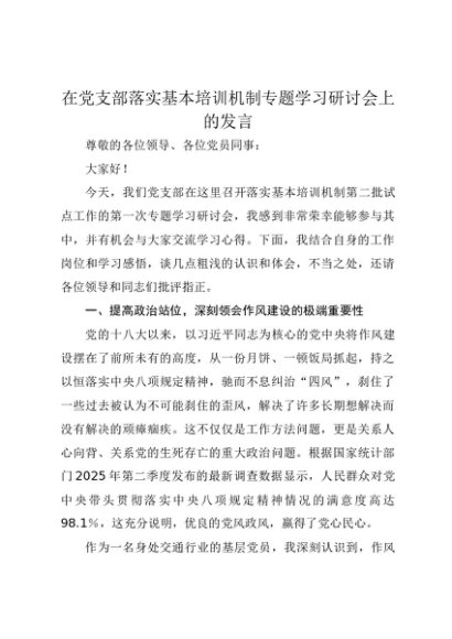 / 【七哥公文】2025年:在党支部落实基本培训机制专题学习研讨会上的发言+更多免费公文+VX:QiGeGongWen2024