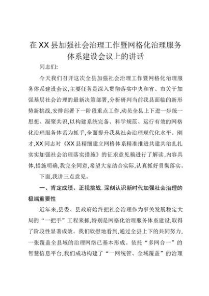 【七哥公文】2025年:在XX县加强社会治理工作暨网格化治理服务体系建设会议上的讲话+更多免费公文+VX:QiGeGongWen2024