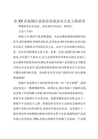 【七哥公文】2025年:在XX市泵阀行业协会首届会员大会上的讲话+更多免费公文+VX:QiGeGongWen2024