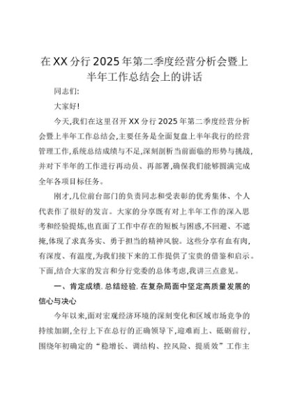 【七哥公文】2025年:在XX分行2025年第二季度经营分析会暨上半年工作总结会上的讲话+更多免费公文+VX:QiGeGongWen2024