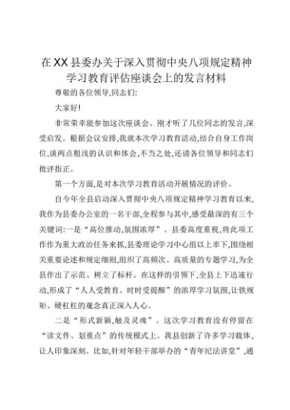 【七哥公文】2025年:在XX县委办关于深入贯彻中央八项规定精神学习教育评估座谈会上的发言材料+更多免费公文+VX:QiGeGongWen2024