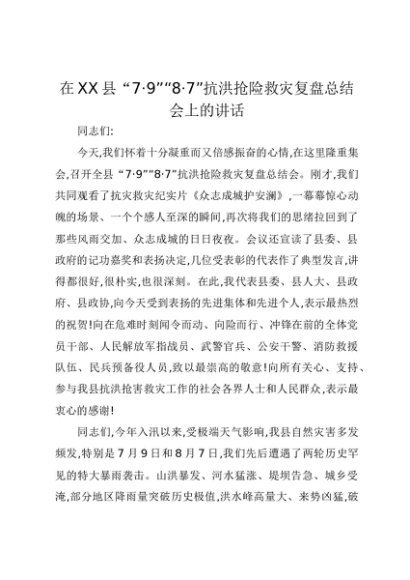 【七哥公文】2025年:在XX县“7·9”“8·7”抗洪抢险救灾复盘总结会上的讲话+更多免费公文+VX:QiGeGongWen2024