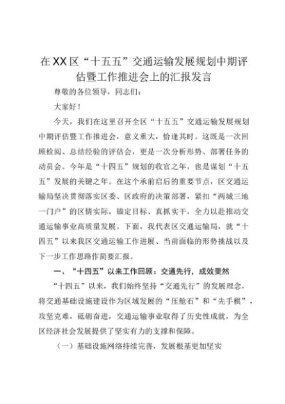 【七哥公文】2025年:在XX区“十五五”交通运输发展规划中期评估暨工作推进会上的汇报发言+更多免费公文+VX:QiGeGongWen2024