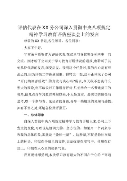 【七哥公文】2025年:评估代表在XX分公司深入贯彻中央八项规定精神学习教育评估座谈会上的发言+更多免费公文+VX:QiGeGongWen2024