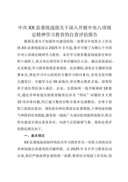 【七哥公文】2025年:中共XX县委统战部关于深入开展中央八项规定精神学习教育的自查评估报告+更多免费公文+VX:QiGeGongWen2024