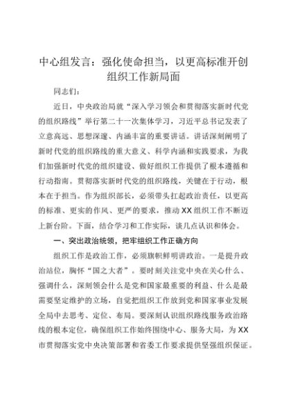 【七哥公文】2025年:中心组发言:强化使命担当,以更高标准开创组织工作新局面+更多免费公文+VX:QiGeGongWen2024