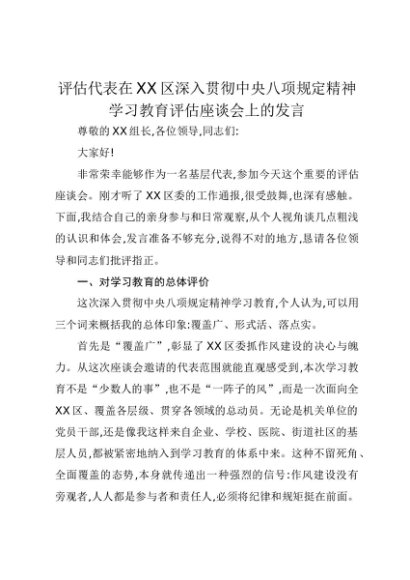 【七哥公文】2025年:评估代表在XX区深入贯彻中央八项规定精神学习教育评估座谈会上的发言+更多免费公文+VX:QiGeGongWen2024
