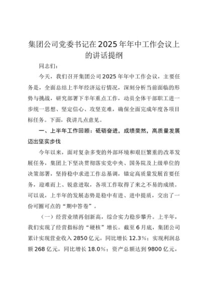 【七哥公文】2025年:集团公司党委书记在2025年年中工作会议上的讲话提纲+更多免费公文+VX:QiGeGongWen2024