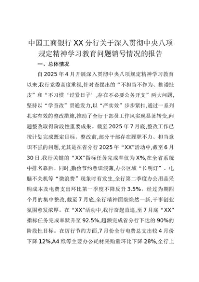 【七哥公文】2025年:中国工商银行XX分行关于深入贯彻中央八项规定精神学习教育问题销号情况的报告+更多免费公文+VX:QiGeGongWen2024