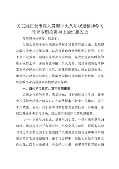 【七哥公文】2025年:民宗局在全市深入贯彻中央八项规定精神学习教育专题推进会上的汇报发言+更多免费公文+VX:QiGeGongWen2024