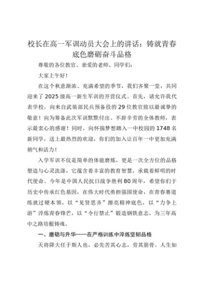 【七哥公文】2025年:校长在高一军训动员大会上的讲话:铸就青春底色磨砺奋斗品格+更多免费公文+VX:QiGeGongWen2024