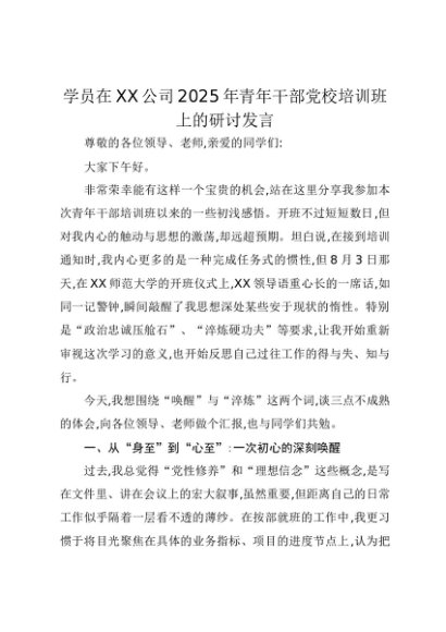 【七哥公文】2025年:学员在XX公司2025年青年干部党校培训班上的研讨发言+更多免费公文+VX:QiGeGongWen2024
