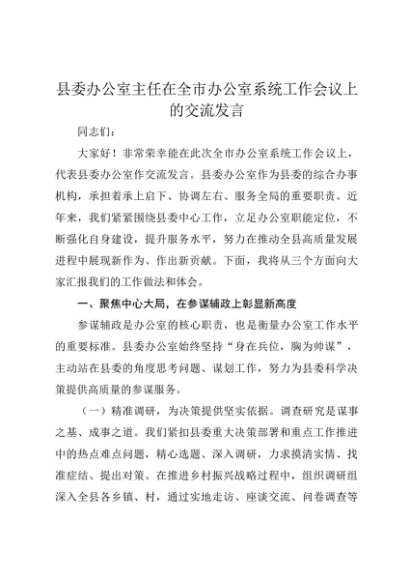 【七哥公文】2025年:县委办公室主任在全市办公室系统工作会议上的交流发言+更多免费公文+VX:QiGeGongWen2024