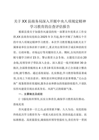 【七哥公文】2025年:关于XX县商务局深入开展中央八项规定精神学习教育的自查评估报告+更多免费公文+VX:QiGeGongWen2024