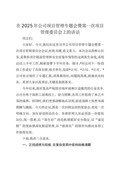 【七哥公文】2025年:在2025年公司项目管理专题会暨第一次项目管理委员会上的讲话+更多免费公文+VX:QiGeGongWen2024