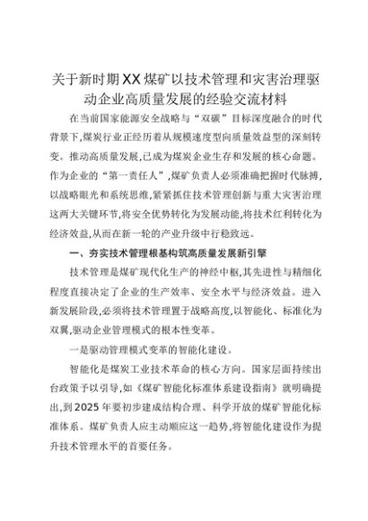【七哥公文】2025年:关于新时期XX煤矿以技术管理和灾害治理驱动企业高质量发展的经验交流材料+更多免费公文+VX:QiGeGongWen2024