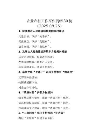 【七哥公文】2025年:农业农村工作写作提纲30例(2025.08.26)+更多免费公文+VX:QiGeGongWen2024