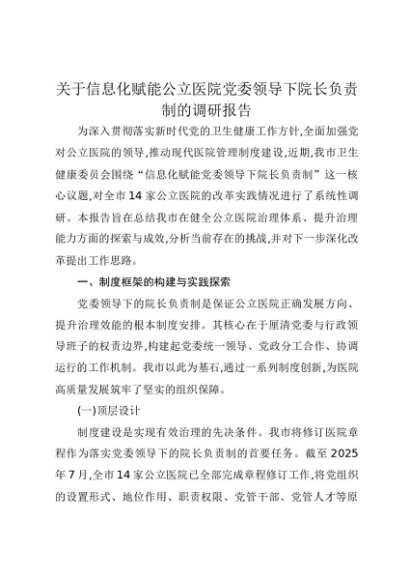 【七哥公文】2025年:关于信息化赋能公立医院党委领导下院长负责制的调研报告+更多免费公文+VX:QiGeGongWen2024