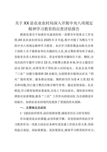 【七哥公文】2025年:关于XX县农业农村局深入开展中央八项规定精神学习教育的自查评估报告+更多免费公文+VX:QiGeGongWen2024