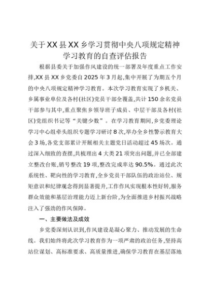 【七哥公文】2025年:关于XX县XX乡学习贯彻中央八项规定精神学习教育的自查评估报告+更多免费公文+VX:QiGeGongWen2024