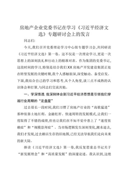 【七哥公文】2025年:房地产企业党委书记在学习《习近平经济文选》专题研讨会上的发言+更多免费公文+VX:QiGeGongWen2024