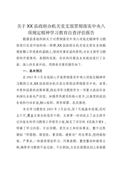 【七哥公文】2025年:关于XX县政府办机关党支部贯彻落实中央八项规定精神学习教育自查评估报告+更多免费公文+VX:QiGeGongWen2024
