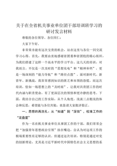 【七哥公文】2025年:关于在全省机关事业单位团干部培训班学习的研讨发言材料+更多免费公文+VX:QiGeGongWen2024