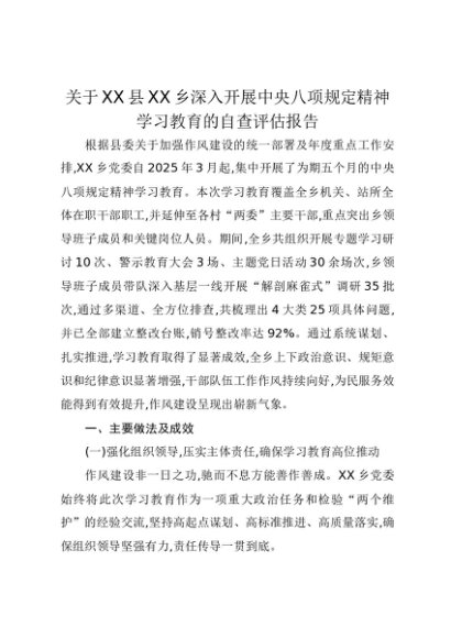 【七哥公文】2025年:关于XX县XX乡深入开展中央八项规定精神学习教育的自查评估报告+更多免费公文+VX:QiGeGongWen2024