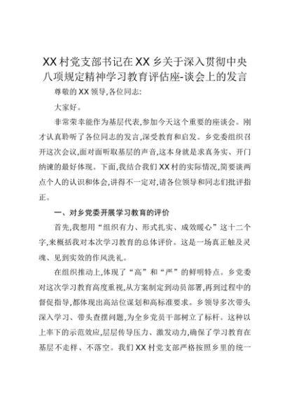 【七哥公文】2025年:XX村党支部书记在XX乡关于深入贯彻中央八项规定精神学习教育评估座-谈会上的发言+更多免费公文+VX:QiGeGongWen2024