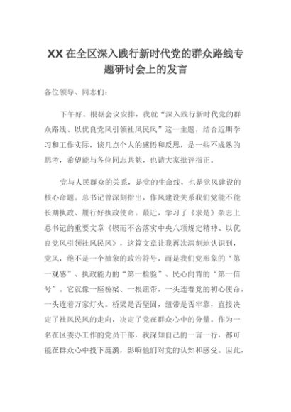 【七哥公文】2025年:XX在全区深入践行新时代党的群众路线专题研讨会上的发言+更多免费公文+VX:QiGeGongWen2024